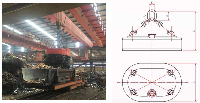 適用于鋼鐵廠廢鋼車間、港口碼頭的列車、大型汽車、船舶等長方形箱式運輸場合裝卸廢鋼鐵、鑄鐵錠及鋼球等。