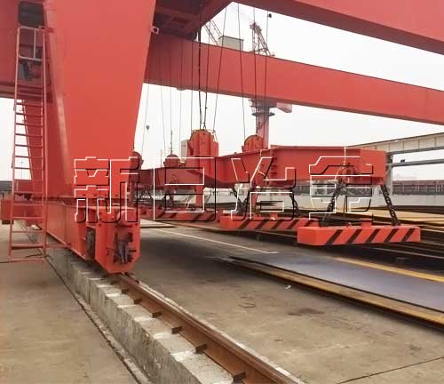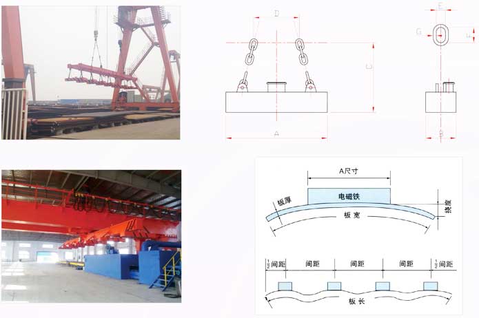 本系列產(chǎn)品專為吊運鋼板而設計,吊運作業(yè)安全、迅速、準確。選型時應考慮作業(yè)時鋼板彎曲變形將影響安全搬運,必須注意電磁鐵的長度與鋼板厚度和板寬之間的關系,同時考慮長鋼板吊運時可能出現(xiàn)彎曲變形而影響安全搬運,所以在吊運長尺寸鋼板時,請使用多臺電磁鐵聯(lián)用,對于中厚板(6mm~32mm)電磁鐵的間距以3~4 米為宜,兩端外伸部分的長度取間距的二分之一。